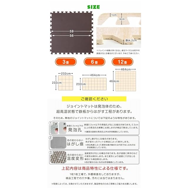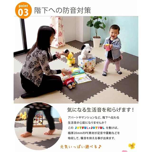 ・表面の凹凸の深さに若干の個体差がある場合がございます。 ・ロットによって色味が異なる場合がございます。 ・床暖房の種類等によって、商品に多少の反りが生じる場合がございます。 ・PE素材の特性上、使用するうちに負荷がかかる部分に多少のへたりが生じます。 そのため、既に使用しているマットに新しいマットを繋げて使用する際、上手く繋がらない場合もございますので、予めご了承ください。 2019年1月10日に素材をEVAからPEに変更しました ※床材(塩化ビニル・フローリング等)によって、色移りや変色が起こる場合がございます。床とマットの間に敷物や防護シートを敷いていただくことを推奨しております。 ※抗菌加工がなされてない類似品が出回っております。じょいふるじょいふるBESTは品質にこだわった当店のオリジナル商品です。類似品にはご注意ください。