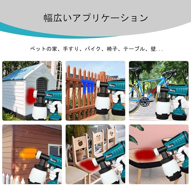 【多目的な用途】- このコードレススプレーガンは電源コードの制約から解放され、効率的かつ制約のない操作が可能です。キャビネット、車両、壁、家具、手すり、ホルムアルデヒドの浄化、フェンス、屋根、クラフト、木製品など、屋内外の幅広いプロジェクトに使用できます。