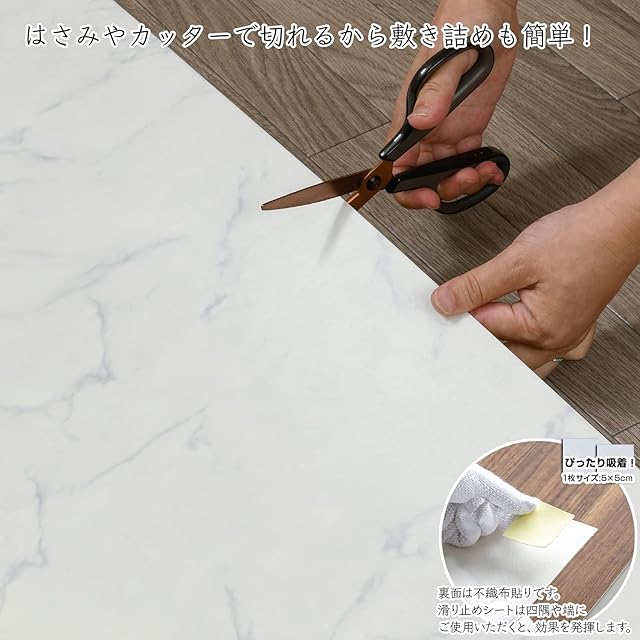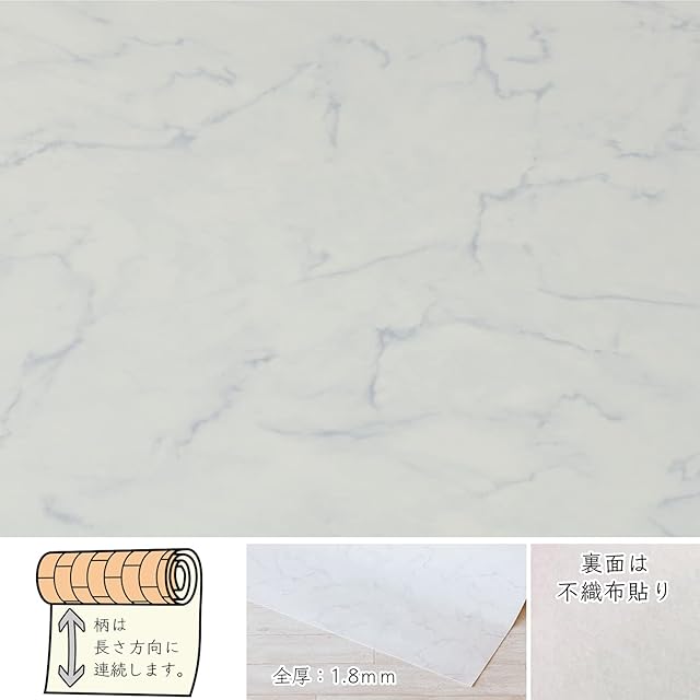 お部屋が一気におしゃれな雰囲気にかわる、人気の大理石柄。空間全体も明るくなります。水や汚れに強く、リアルな質感を感じられる、おしゃれな床保護リメイクシート。汚しても拭くだけのかんたんお手入れ。適度なクッション性で床を傷から保護。リビングのフローリング、キッチンや洗面所などの水回り、玄関などの床を簡単にリメイクできます。