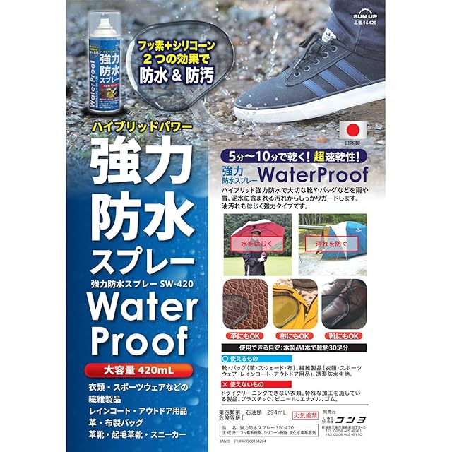 ●速乾10分タイプ。※防水スプレーは乾いてから効果を発揮します。一般的な防水スプレーに比べ乾燥が速い速乾タイプ。 ●「〇(使えるもの)」靴・バッグ(革・スェード・布)、繊維製品(衣類・スポーツウェア・レインコート・アウトドア用品)