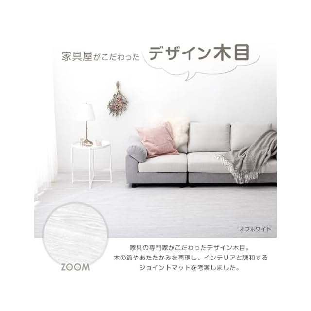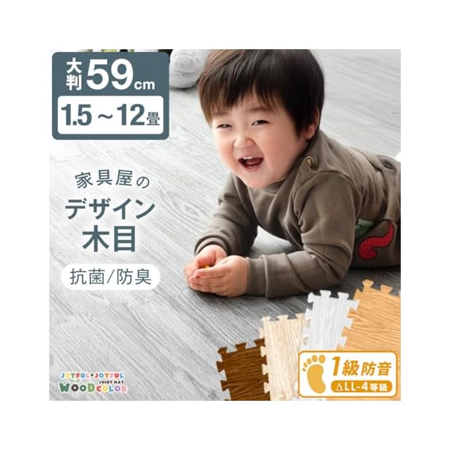 商品の仕様上、ジョイント部分(サイドパーツ含む)の木目の柄は合わない場合がございます。 ジョイントマットに使用する樹脂素材については、より安全な素材となるよう技術の向上がなされており、その過程で現在使用している素材はPEと記載を行うことが適切となりましたので、2019年1月21日にEVAからPEに表記を変更しました。日本の大手量販店でも随時、記載の変更が行われており、品質を悪化させたものではありませんのでご安心ください。 ・床材(塩化ビニル・フローリング等)によって、色移りや変色が起こる場合がございます。床とマットの間に敷物や防護シートを敷いていただくことを推奨しております。 ※2020年2月26日より商品ページでの「大判58cmタイプ」の表記を「大判59cm」に変更をしました。 実際の商品サイズに変更はございませんので、過去58cmタイプをお買い上げいただいたお客様は、そのまま接続が可能です。 ※2022年12月1日にホワイトとライトグレーの販売を終了し、ライトオークとオフホワイトの販売を開始しました。
