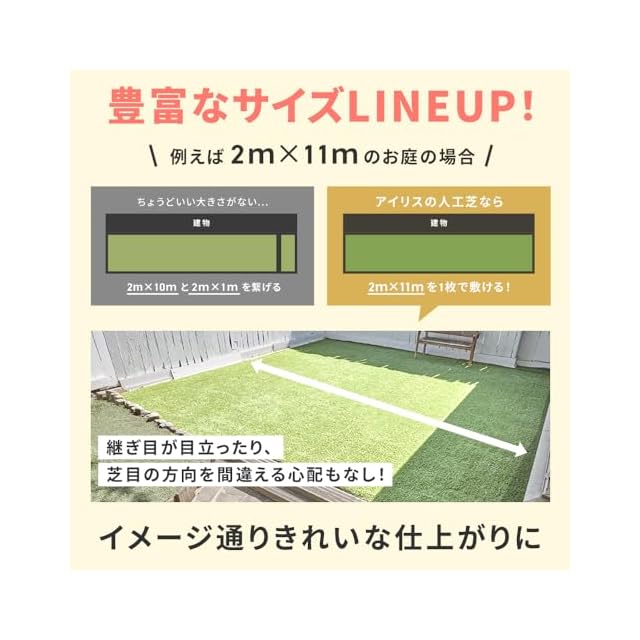 ※2025年4月3日:一部仕様(U字釘の色)リニューアルしました。 変更前:シルバー 変更後:グリーン 在庫の都合上、リニューアル前・後の商品が前後してお届けとなる場合がございます。予めご了承ください。お庭やベランダなど、広い場所にも敷きやすく、継ぎ目が目立ちにくい人工芝です。
