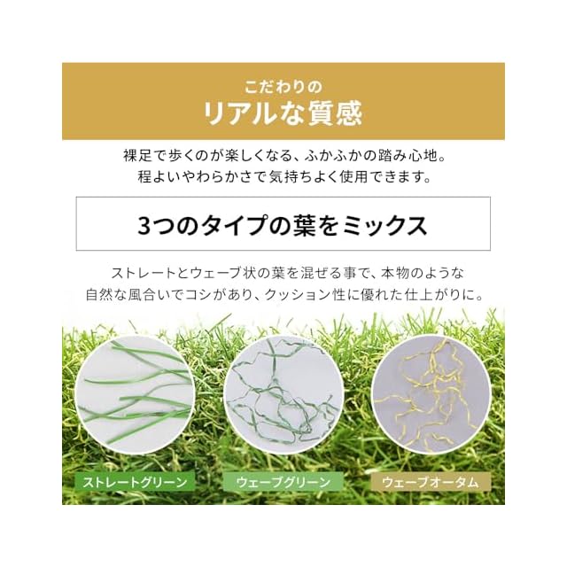 こだわりの質感で、天然の芝生のような触り心地。3種類の色味と質感の異なる葉を混ぜることで、リアルな風合いと触感を再現。