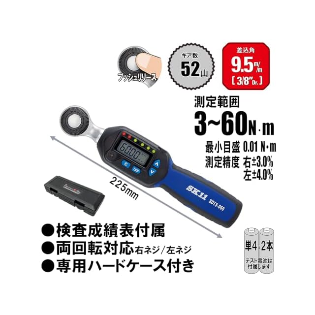 ラチェットギア数:52山、電源:単4乾電池2本、操作モード:ピークホールドモード・トラックモード