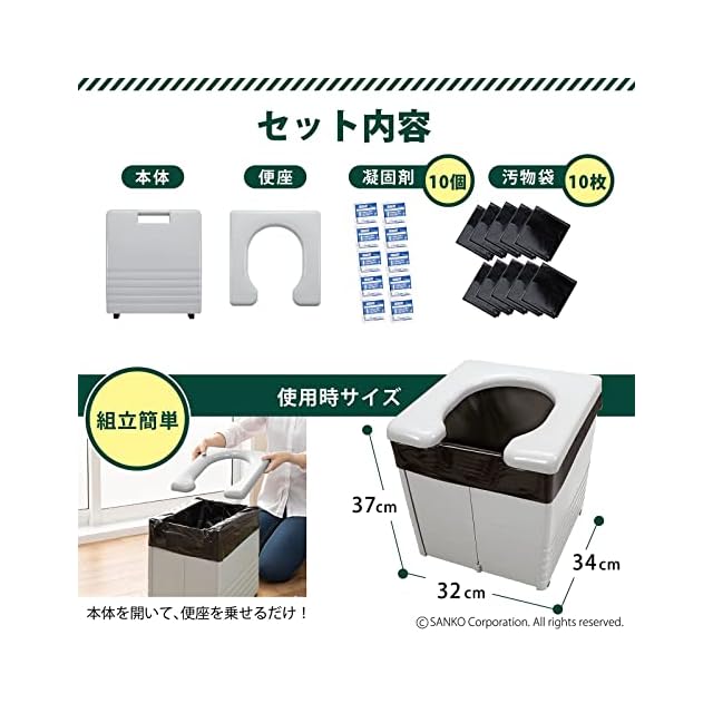 【素材】便座/ポリプロピレン、本体/紙、凝固剤/高分子ポリマー、汚物袋/ポリエチレン