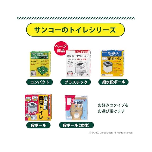 【素材】便座/ポリプロピレン、本体/紙、脚キャップ/ポリエチレン、凝固剤/高分子ポリマー、汚物袋/ポリエチレン、簡易ポンチョ/ポリエチレン
