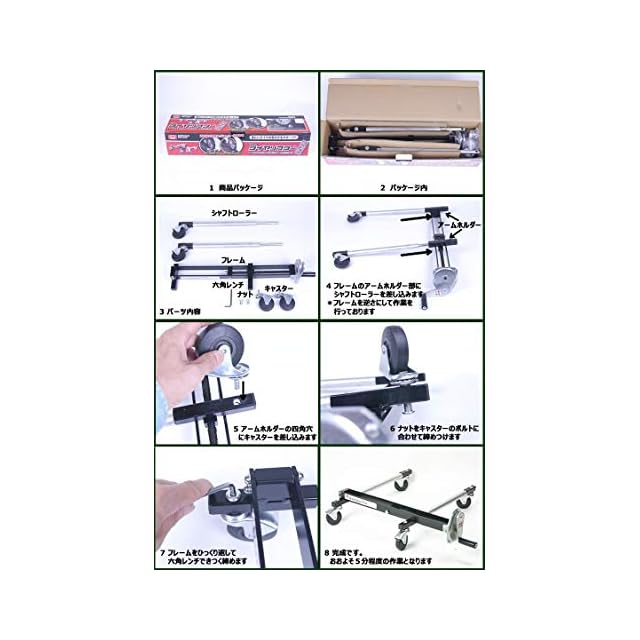 内容物:フレーム-1個、回転アーム(シャフト・ローラー)キャスター付き-2本、キャスター-2個、ナット&ワッシャ-2個、六角レンチ-1本