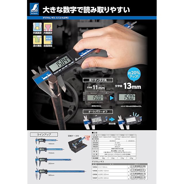 大きな数字で読み取りやすいデジタルノギスです。