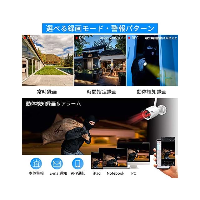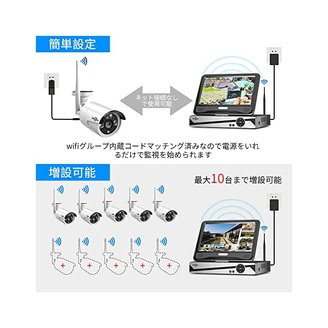 【ワイヤレス接続・簡単操作】 ワイヤレスの防犯カメラですので、設置が簡単で配線工事が不要です。IPカメラとレコーダーの電源を入れるだけで自動にコードをマッチングしますので、ローカル監視する場合、インタネット接続なしに監視や再生が可能です。遠隔操作する場合はLANケーブルでNVRシステムとホームルータを接続する事が必要となります。