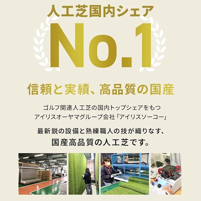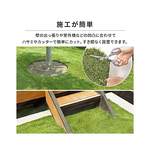 こだわりの質感で、天然芝のような触り心地。3種類の色味と質感の異なる葉を混ぜることで、リアルな風合いと触感を再現。カッターで簡単にカットできるので、設置場所に合わせて設置も簡単。安心の国内生産品です。