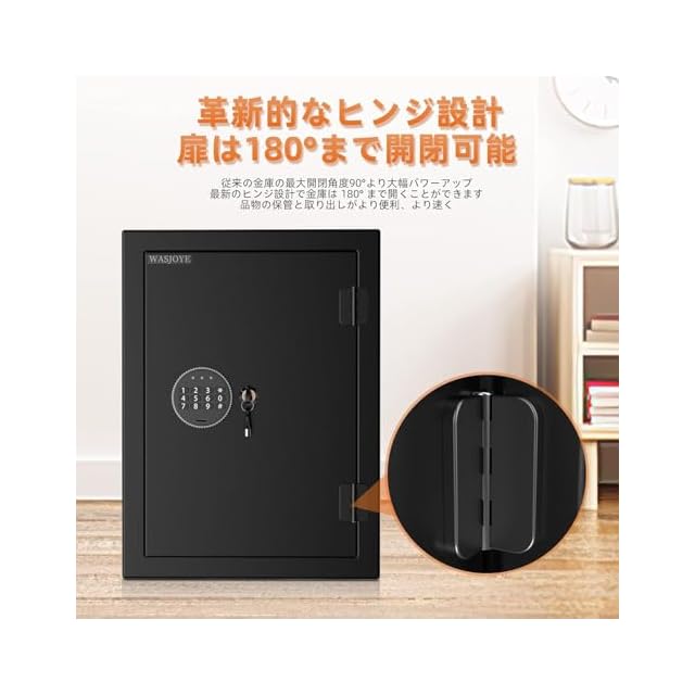 WASJOYE 耐火金庫 テンキー式 耐火引き出し内蔵 家庭用 店舗用 会社用 ホテル用 防犯耐火金庫 180°ドア開門 A4ファイル対応 警報アラーム付き 鍵付き 床・壁に固定可能 日本語取扱説明書(57.0L)
