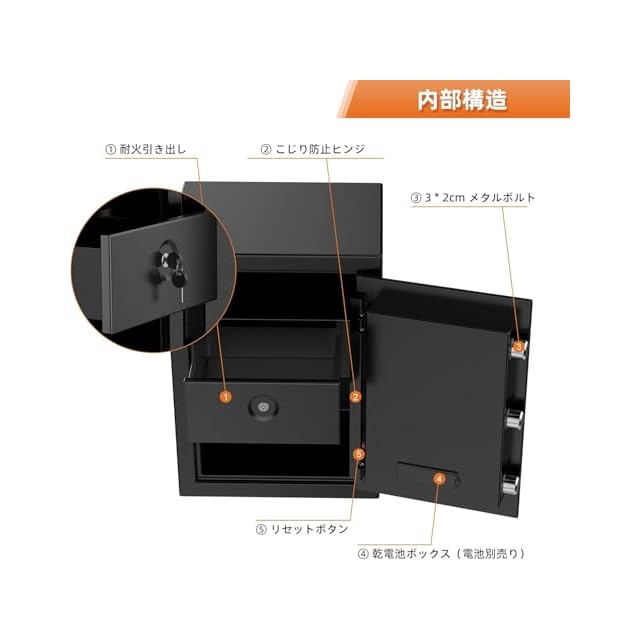 高度なセキュリティー:本体が高強度の鋼で作られ、4cm厚手の金庫扉と三つの直径2cmボルトを加えて、簡単に破壊と侵入ができません。