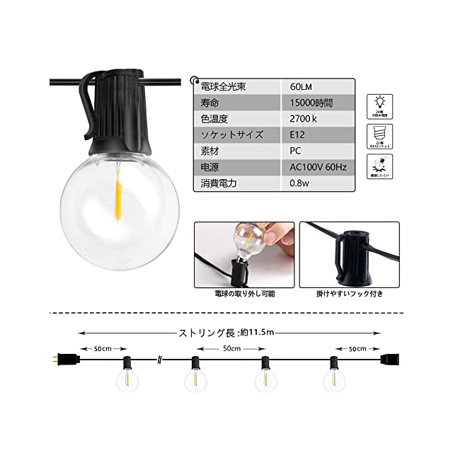 『商品仕様』:ストリング長:11.5m、間隔:0.5m、電球消費電力:0.8w 省エネ96%、定格電圧:AC100V 50/60Hz、電球全光束:60lm、色温度:2700k、ビーム角度:360º、口金サイズ:E12、電球数:22個+2個(付き)、ソケット個数:22個、防水等級:IP44、重量:0.65kg