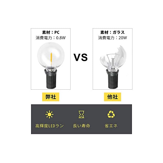 『破損しにくい・2年』:電球は破損しにくい環境に優しいPC素材で作られており、ガラス電球ほど脆弱ではありません。省エネのLED電球は、消費電力が少なく、数時間で過熱しません。ストリングライトは高品質の黒いゴム電線を採用しており、耐熱性と耐寒性に優れ、電線の寿命を長くしています。弊店の製品は購入日から24ヶ月の期間があります。