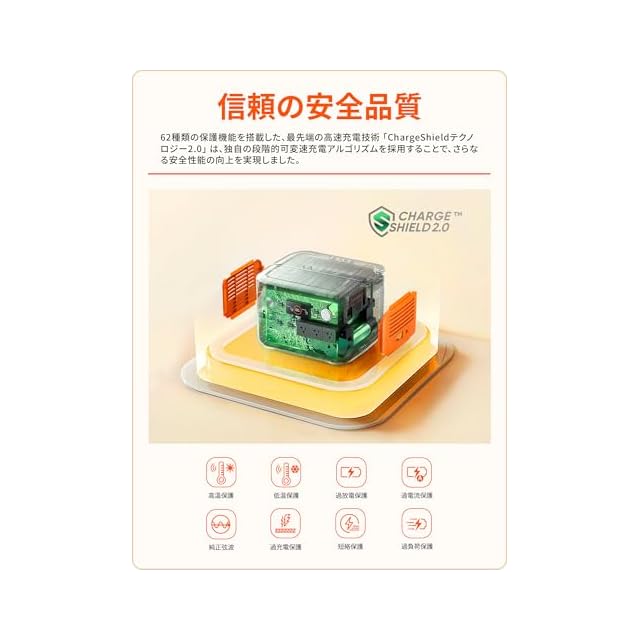 【進化したChargeShield2.0】62種類の保護機能を搭載した、先端の高速充電技術 「ChargeShieldテクノロジー2.0」 は、独自の段階的可変速充電アルゴリズムを採用することで、さらなる安 全性能の向上を実現しました。