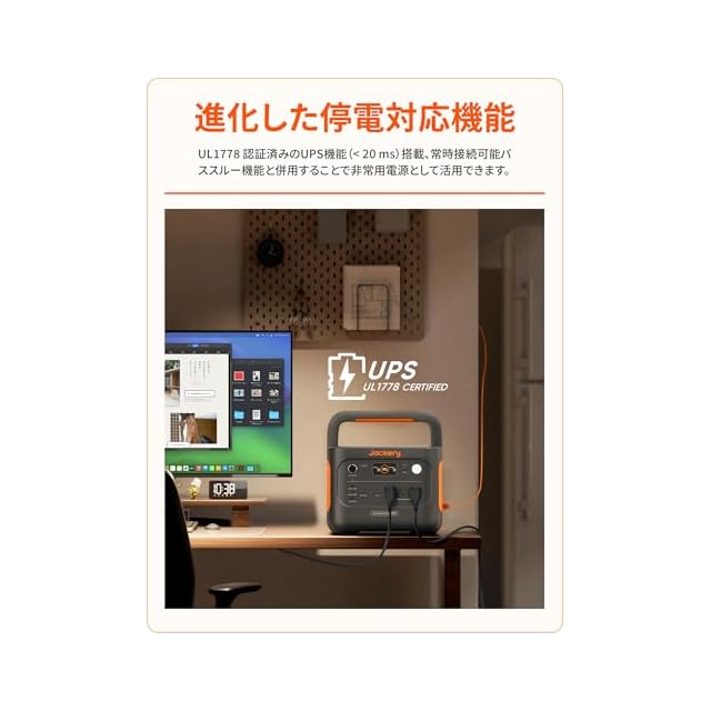 【UPS&パススルーで普段から停電に備える】UL1778 認証済みのUPS(< 20 ms)機能搭載、常時接続可能のパススルー機能と併用することで非常用電源として使えます。突然の停電時でも連続して電力を供給します。家庭やオフィスでの電力安全性を向上させ、大切なデバイスを保護します。