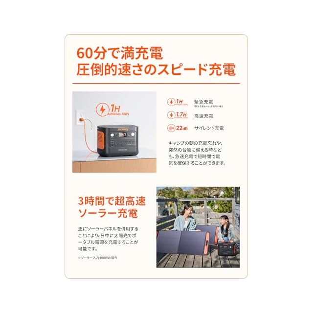 【多様な充電方式と充電モード】「緊急充電モード」では約60分でフル充電、「高速充電モード」では約1.7時間でフル充電が可能です。ACコンセント、カーチャージャー(別売)、ソーラーパネルなど、さまざまな充電方法に対応し、あらゆるシーンで迅速に充電できます。