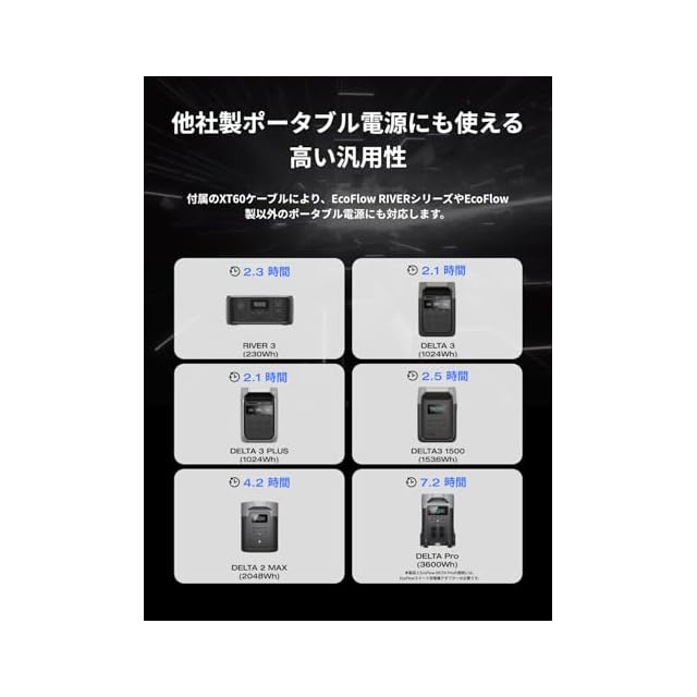 【2年間全機種】全機種に2年間のメーカーが付帯し、突然の故障時も迅速な交換対応が可能です* 本製品とEcoFlow DELTA Proの接続には、EcoFlowスマート発電機アダプター(EcoFlow DELTA Pro用XT150変換アダプター)が必要です。 入力ポート数の制約上、本体にエクストラバッテリーを接続した状態でAlternater Chargerは接続できません。ご了承ください。