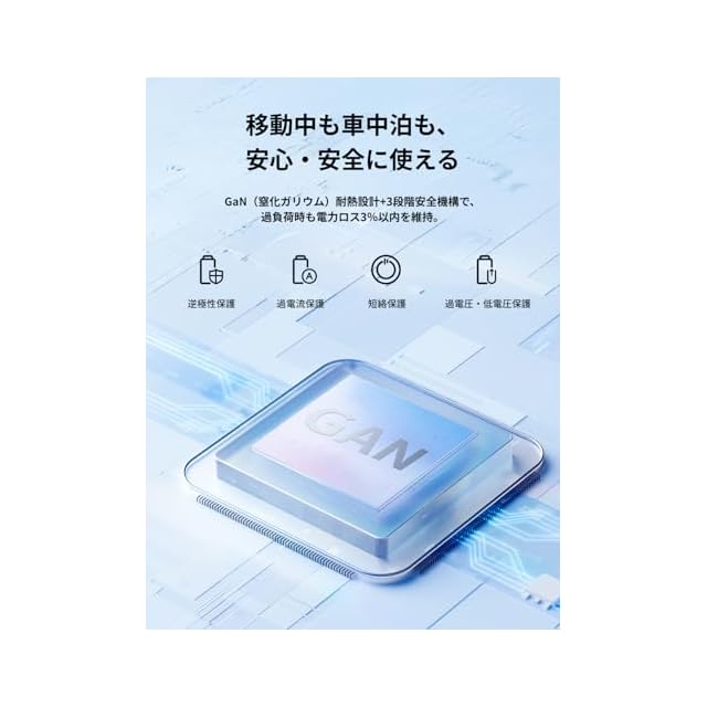 【移動中も車中泊も、安心・安全に使える】EcoFlow 500W Alternator Charge は、耐熱性に優れたGaN(窒化ガリウム)テクノロジーを採用しているため、きわめて安全かつ効率的に充電を行うことができます。また、過剰な電力消費やメインバッテリーの損傷を防ぐ低電圧保護に加え、オルタネーターの負荷状態に応じて出力を自動的に調整し、過負荷を防ぎつつわずか3%の電力ロスで電力を供給する機能など、複数の安全機能を備えているため、長旅でも安心してご使用いただけます。