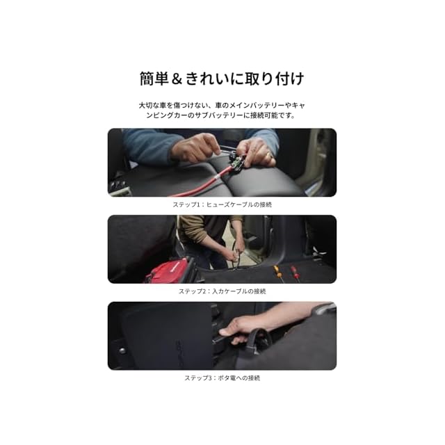 【他社製ポータブル電源にも使える高い汎用性】XT60標準接続で拡張自由付属のXT60ケーブルを介して他社製ポータブル電源と即時接続可能なユニバーサルデザインを採用。SUVやピックアップトラック、キャンピングカーまで、幅広い車中泊の電力ニーズに応えます。(※本製品使用時は、エンジン始動後に電圧が安定してから、本体の電源ボタンを押してください。また、より安定してご使用いただくために保護電圧をエンジン停止時と始動後の中間値に設定いただくことを推奨します。)