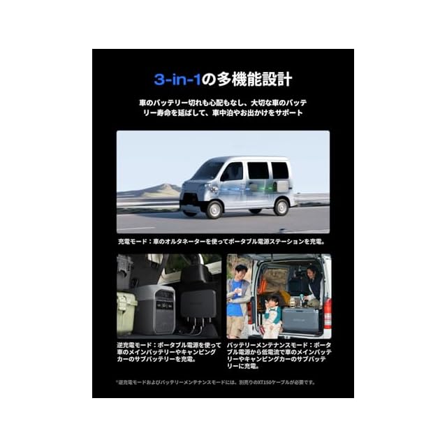 【3つの充電モード搭載】①充電モード:車のオルタネーターを使ってポータブル電源ステーションを充電。②逆充電モード:ポータブル電源を使って車のメインバッテリーやキャンピングカーのサブバッテリーを充電。③バッテリーメンテナンスモード:ポータブル電源から低電流で車のメインバッテリーやキャンピングカーのサブバッテリーに充電し、バッテリーの消耗を防止して寿命延長に貢献。*逆充電モードおよびバッテリーメンテナンスモードには、別売りのXT150ケーブルが必要です。