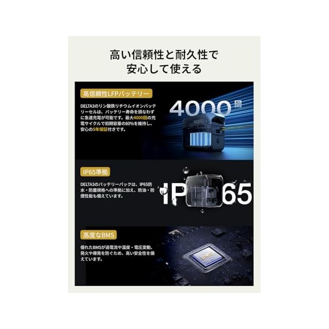 「 寿命は10年間、X-Guardによる三重保護」5年のを与えられ、10年の寿命を誇るEcoFlowのLiFePO4バッテリーセルは、バッテリー寿命を損なわずに急速充電を実現します。最大4,000回のサイクルで容量を80%保持し、業界標準を25%も上回ります。