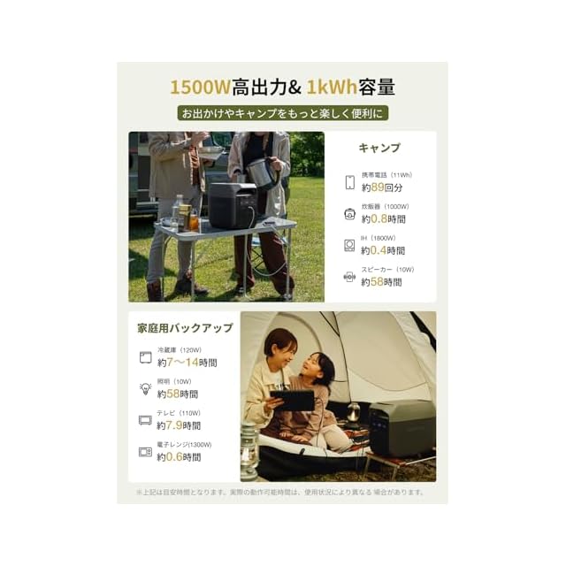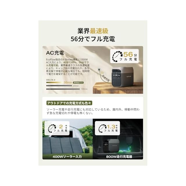「 1,500W AC入力、56分で100%充電」EcoFlowのX-Stream充電テクノロジーと1,500WのAC入力を使用すると、40分で80%、56分で100%充電できます。家庭用バックアップ電源として最適であり、停電の前に56分でバッテリーを満充電にできます。アウトドアキャンプの場合、出発前夜または出発当日の朝にバッテリーを完全充電可能なので、予定時間に遅れずに準備を整えられます。