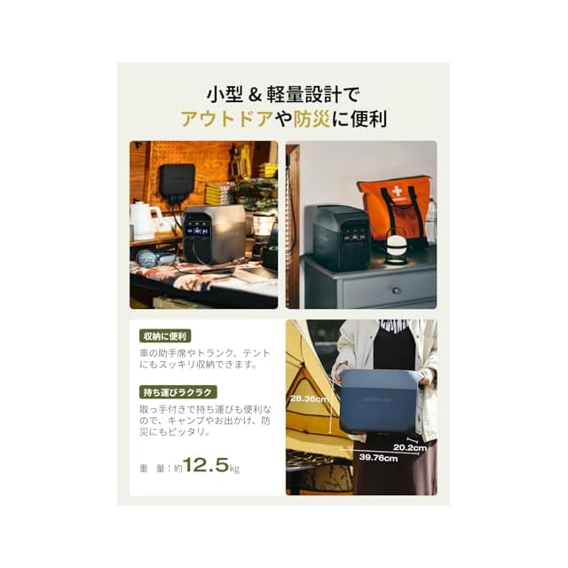 「アプリを使えばスマートなエネルギー管理、本体はコンパクト&軽量」 専用アプリを使えば、DELTA 3 ポータブル電源のリモートコントロールや効率的なエネルギー管理が可能です。つまり、いつでもどこでもバッテリー状態と電力使用量を確認でき、状況把握ができるポータブル電源なのです。コンパクトデザインを誇るDELTA 3 ポータブル電源は13個の多用途出力ポートを有し、多くの電化製品をサポートします。多様な入力ポートも装備し、複数のデバイスに同時に対応します。