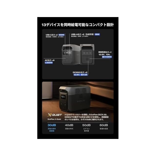 「僅か30dBの超静音、エクストラバッテリー追加で5kWhまで容量拡大」 X-Quietテクノロジーを搭載したEcoFlow DELTA 3 ポータブル電源は、600W以下では全く気にならないほど静かで、自然な環境音(30dB以下)しか聞こえません。テント内や室内で、生活や睡眠の邪魔をしないポータブル電源です。
