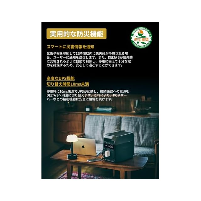 「 <10msで切り替わる高性能UPS&スマート発電機との組み合わせで長時間稼働」 DELTA 3 ポータブル電源が搭載する高信頼性UPSは、10ms未満で切り替わります。これはDELTA 2の30ms未満を大きく上回ります。迅速なUPS起動により、突然の停電でもデータ整合性および機器の安全性をシームレスに確保するポータブル電源なのです。さらに、EcoFlowの1.8kWスマート発電機と組み合わせると、バッテリー残量を心配せずに長時間稼働が可能です。