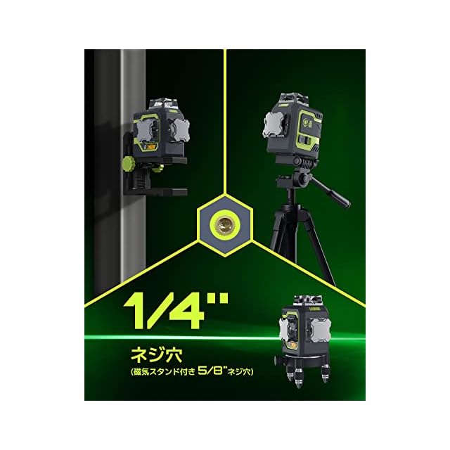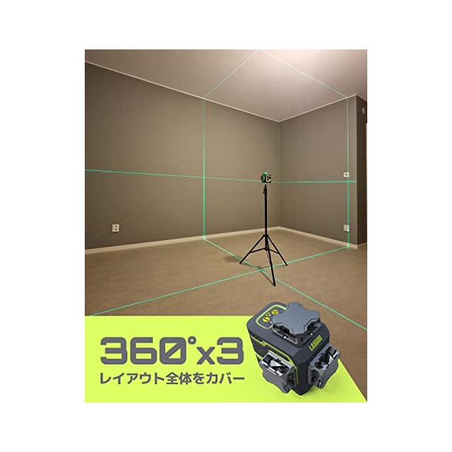 LasGoo LG-3D レーザー墨出し器、レーザー レベル セルフレベリング、3D グリーン ビーム クロスライン レーザー (3x360°) ビルドとアライメント用、2x 充電式リチウムイオン電池 (最大20時間)、マグネット式リフティングローティングスタンド付属 | つむぎ屋