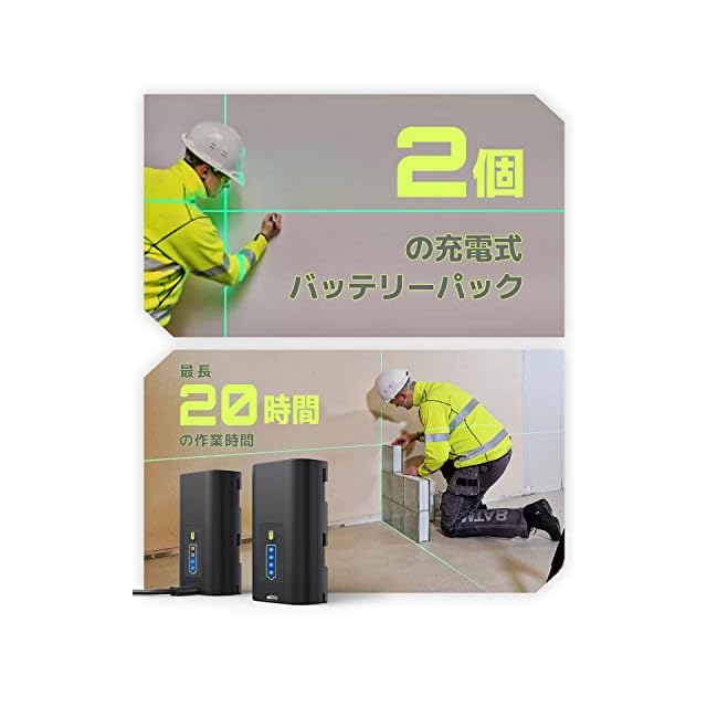 2つの充電式バッテリーパック:LasGooのレーザーレベルには、充電式リチウムイオン電池が2つ付属しており、それぞれの電池で10時間の作業をサポートすることができます。バッテリーパックが2つあるため、作業に集中でき、シンプルで効率的な作業が可能になります