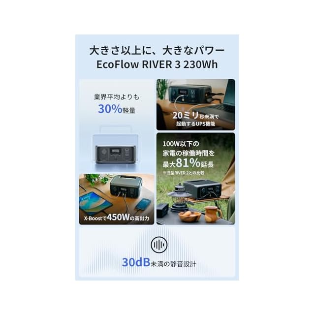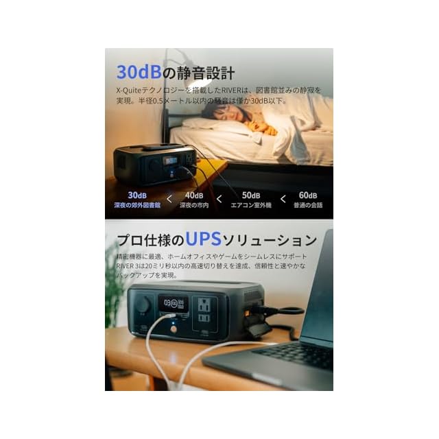 【邪魔にならない超静音ポータブルバッテリー】RIVER 3ポータブルバッテリーはX-Quite技術により、半径0.5メートル以内の騒音は僅か30dB以下、図書館並みの静かさです。生活や睡眠の邪魔になりません。