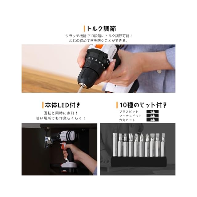 付属品:10種類ビット・ACアダプター・充電器・10.8Vバッテリー
