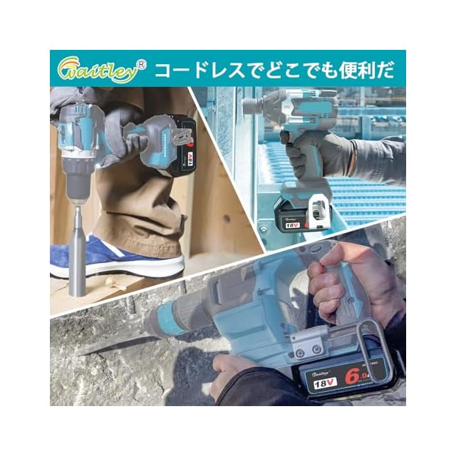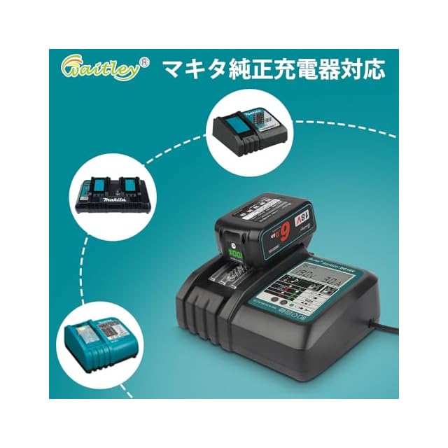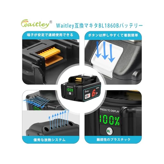 þ〖本製品デザインメリット〗Waitley唯一なデジタル%残量表示で一目瞭然です。小型軽量で簡単に操作できます。難燃性のプラスチックを利用した外殻、耐久性が高く、長期間使用可能です。メモリー効果がないため、継ぎ足し充電が可能。自然放電も少なく仕事率が更にアップなります。