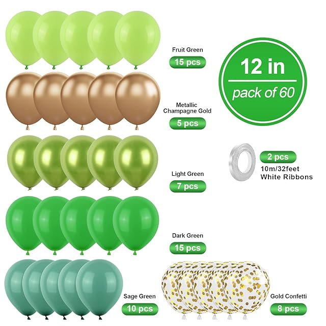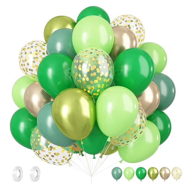 商品内容:グリーン風船40個、金属風船12個、紙吹雪風船8個、リボン2巻。