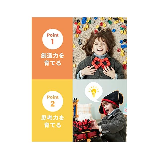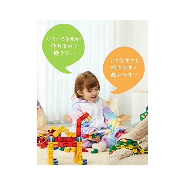 【対象年齢は?】年齢に合わせて色んな遊びができます。<br> ●3~4歳:カチッとつなげたり、ひっぱって外す動作で指先への刺激や脳の活性化に まずは平面的な作品を作り表現力や達成感の習得にも。<br> ●4〜6歳:角度を変えて立体的な作品を作り、空間把握能力や想像力の向上に。<br> ●6歳〜:独創的な作品を作る。自己表現力や構成力の学習に。<br>