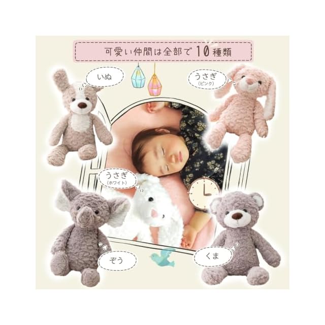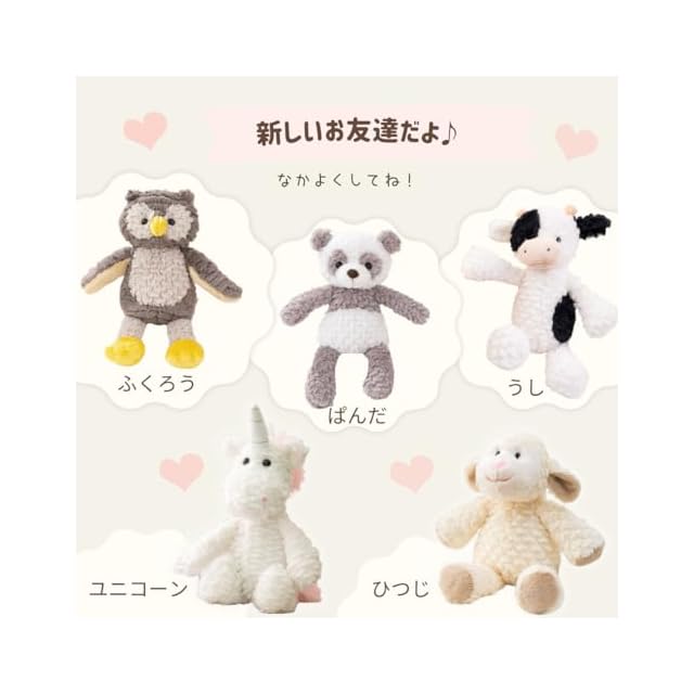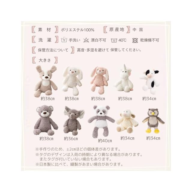 種類:くま、いぬ、ぞう、うさぎホワイト、うさぎピンク、ぱんだ、ユニコーン、うし、ふくろう、ひつじ 大きさ:種類によって異なります。商品ページをご覧ください。