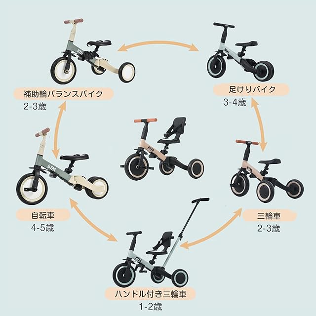 BTM 子供用三輪車 5n1新色 三輪車のりもの 押し棒付き ランニング 三輪車 自転車 おもちゃ 乗用玩具 おしゃれ 1歳-5歳 幼児用 プレゼント お祝い ギフト (オパールグリーン) | つむぎ屋