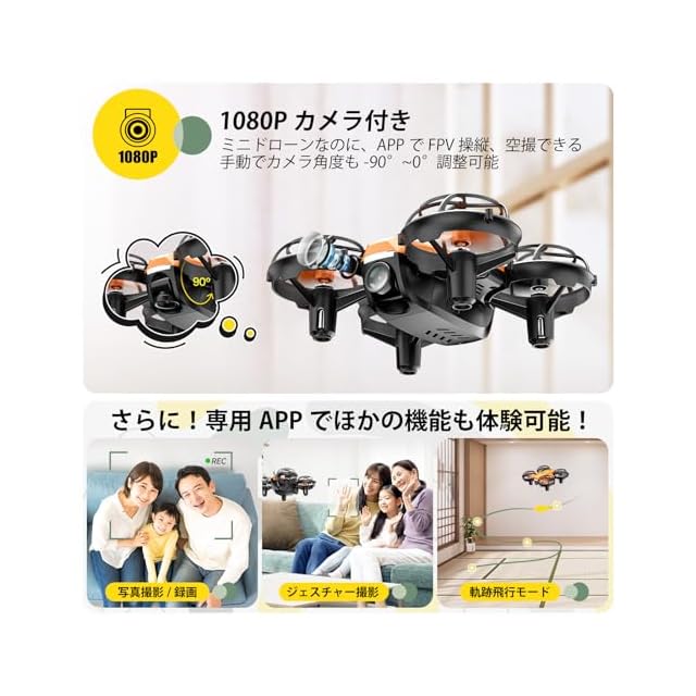 【1080Pカメラ搭載】ミニドローンなのに、1080P HDカメラが搭載されて、APPでFPV操縦、空撮練習が実現できます。さらに、手動でカメラ角度が-90°~0°調整可能なので、違う角度から撮影できます。また、アプリでジェスチャー撮影、軌跡飛行モードなどの機能も体験可能で、本格的な撮影機能満載!