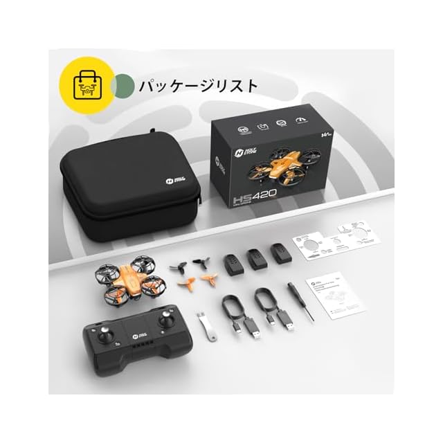 【パッケージリスト】機体*1; 送信機*1 ;収納ケース*1;バッテリー*3;予備プロペラ*4 ;充電ケーブル*2 ;プロペラ用具*1 ;ドライバー*1 ;日本語取扱説明書*1