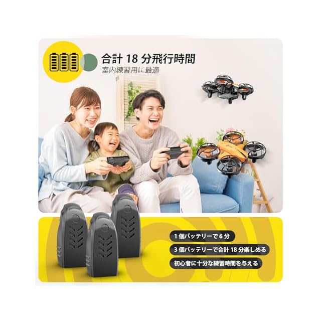 【18分飛行時間】3つのバッテリーを付属されて、1個の飛行時間が6分で、3個で合計18分操縦可能、思う存分に撮影できます。