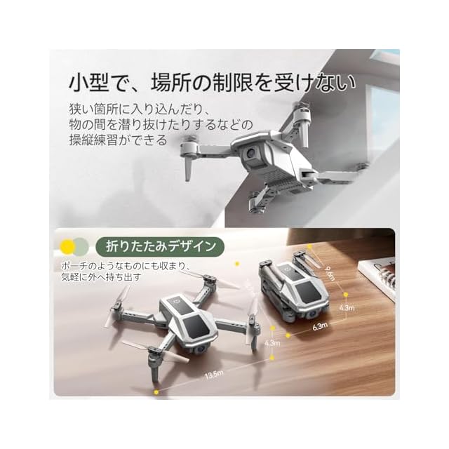 【折りたたみデザイン】折り畳み式のデザインで、持ち運びの軽さ、収納の便利さを享受することができます。また、小型のトイドローンなので、室内、ドローン練習場などで狭い空間に入り込んだり、物の間を潜り抜けたりするなどの操縦練習にも最適です。