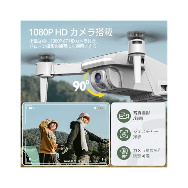 【1080Pカメラ搭載】1080P 67°HDカメラが搭載され、カメラ角度も90°調整できます。リアルタイム記録のほか、専用アプリでジェスチャー撮影も対応可能です。小型なのに様々なドローン撮影の練習ができます。