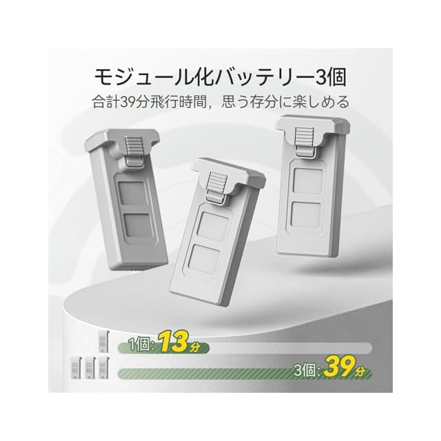 【合計39分飛行時間】モジュール化バッテリーが3個付き、1個の使用時間が13分で、合計39分の飛行時間となり、思う存分にドローン撮影を楽しめます。