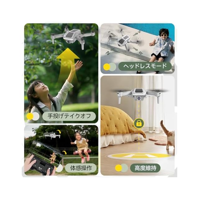 【初心者に優しいドローン】手投げテイクオフ、高度維持、ヘッドレスモード、体感操作、操縦モード1/2切替など、初心者でも楽しめるように考えられた便利な機能を備えています。ドローン操縦に慣れていなくてもそれらの機能で上手く練習できます。
