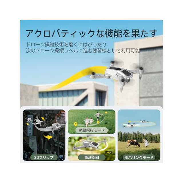 【アクロバティックな機能を果たす】ドローン操縦初期を超え、次の操縦レベルに進もうとしたら、360°宙返り、高速旋回、軌跡飛行モード、ホバリングモードなど、よりドローンを楽しむためのさまざまな機能も果たせる当製品は最適です。それらのアクロバティックな機能で操縦技術を練習しながら、ドローンの新たな利用場面も見つけましょう!