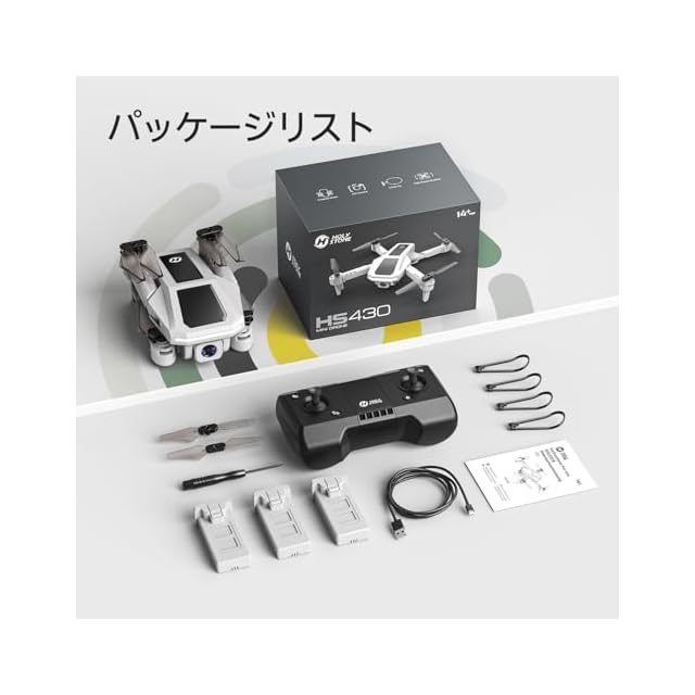 【パッケージリスト】機体*1 ;送信機*1 ;バッテリー*3 ;プロペラガード*4 ;予備プロペラ*2 ;充電ケーブル*1 ; ドライバー*1 ;日本語説明書*1