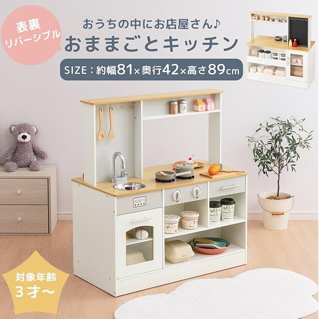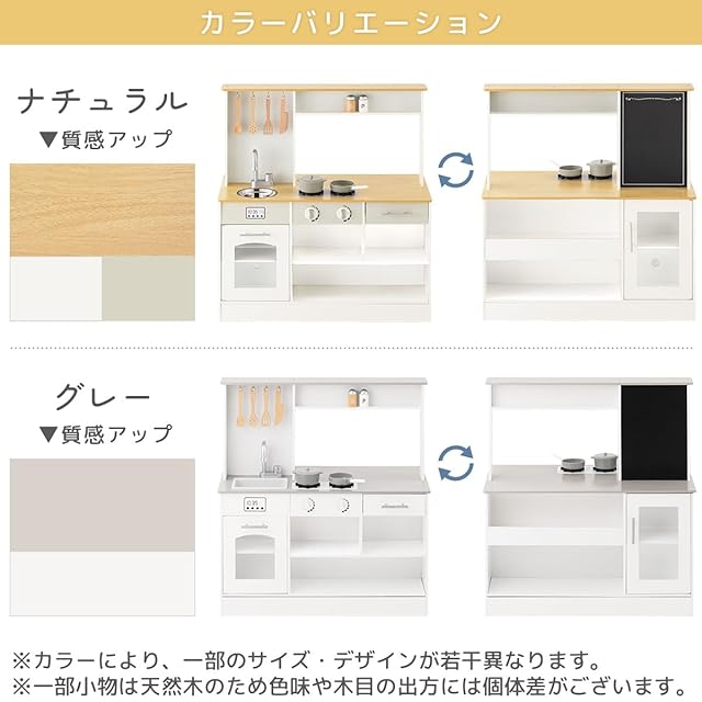 【カラー共通】材質 キッチン本体:MDF(アクリル樹脂塗装) 【ナチュラル】 材質 小窓:PET(ポリエチレンテレフタレート) シンク:ステンレス鋼 キャスター:ポリプロピレン樹脂、スチール 木製調理器具:天然木ケヤキ材(無塗装) その他:ABS樹脂、メラミン樹脂、天然木