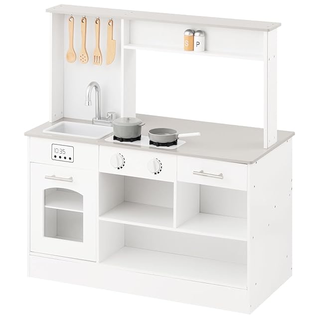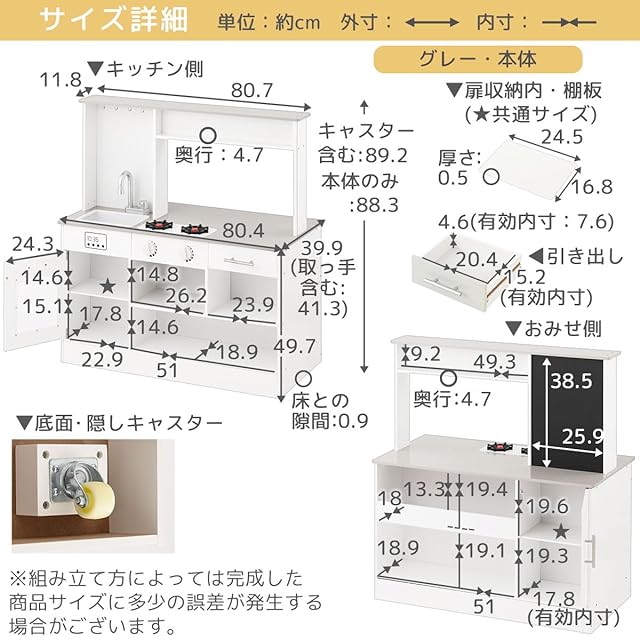【カラー共通】材質 キッチン本体:MDF(アクリル樹脂塗装) 【グレー】 小窓:アクリル板 シンク:PET(ポリエチレンテレフタレート) キャスター:ナイロン、スチール 木製調理器具:天然木ブナ材(無塗装) その他:ABS樹脂、天然木